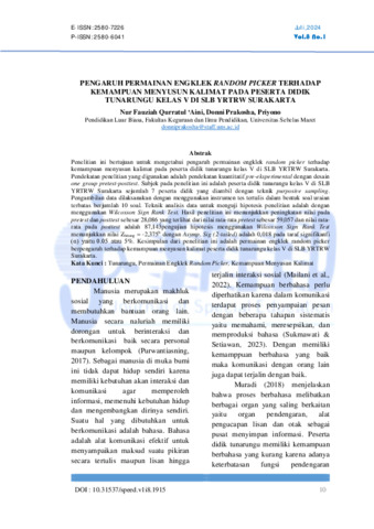Nur, Fauziah Qurratul 'Aini and Donni, Prakosha and Priyono, Priyono (2024) Pengaruh permainan engklek random picker terhadap kemampuan menyusun kalimat pada peserta didik tunarungu kelas V di SLB YRTRW Surakarta. Journal of Special Education (SPEED), 8 (1): 2. pp. 10-19. ISSN 2580-6041