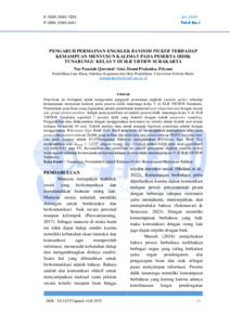 Penelitian ini bertujuan untuk mengetahui pengaruh permainan engklek random picker terhadap kemampuan menyusun kalimat pada peserta didik tunarungu kelas V di SLB YRTRW Surakarta. Pendekatan penelitian yang digunakan adalah pendekatan kuantitatif pre-eksperimental dengan desain one group pretest-posttest. Subjek pada penelitian ini adalah peserta didik tunarungu kelas V di SLB YRTRW Surakarta sejumlah 7 peserta didik yang diambil dengan teknik purposive sampling. Pengambilan data dilaksanakan dengan menggunakan instrumen tes tertulis dalam bentuk soal uraian terbatas berjumlah 10 soal. Teknik analisis data untuk menguji hipotesis penelitian adalah dengan mPenelitian ini bertujuan untuk mengetahui pengaruh permainan engklek random picker terhadap kemampuan menyusun kalimat pada peserta didik tunarungu kelas V di SLB YRTRW Surakarta. Pendekatan penelitian yang digunakan adalah pendekatan kuantitatif pre-eksperimental dengan desain one group pretest-posttest. Subjek pada penelitian ini adalah peserta didik tunarungu kelas V di SLB YRTRW Surakarta sejumlah 7 peserta didik yang diambil dengan teknik purposive sampling. Pengambilan data dilaksanakan dengan menggunakan instrumen tes tertulis dalam bentuk soal uraian terbatas berjumlah 10 soal. Teknik analisis data untuk menguji hipotesis penelitian adalah dengan menggunakan Wilcoxson Sign Rank Test. Hasil penelitian ini menunjukkan peningkatan nilai pada pretest dan posttest sebesar 28,086 yang terlihat dari nilai rata-rata pretest sebesar 59,057 dan nilai rata-rata pada posttest adalah 87,143pengujian hipotesis menggunakan Wilcoxson Sign Rank Test menunjukkan nilai Zhitung = -2,375b dengan Asymp. Sig (2-tailed) adalah 0,018 pada taraf signifikanfi (?) yaitu 0.05 atau 5%. Kesimpulan dari penelitian ini adalah permainan engklek random picker berpengaruh terhadap kemampuan menyusun kalimat peserta didik tunarungu kelas V di SLB YRTRW Surakarta. enggunakan Wilcoxson Sign Rank Test. Hasil penelitian ini menunjukkan peningkatan nilai pada pretest dan posttest sebesar 28,086 yang terlihat dari nilai rata-rata pretest sebesar 59,057 dan nilai rata-rata pada posttest adalah 87,143pengujian hipotesis menggunakan Wilcoxson Sign Rank Test menunjukkan nilai Zhitung = -2,375b dengan Asymp. Sig (2-tailed) adalah 0,018 pada taraf signifikanfi (?) yaitu 0.05 atau 5%. Kesimpulan dari penelitian ini adalah permainan engklek random picker berpengaruh terhadap kemampuan menyusun kalimat peserta didik tunarungu kelas V di SLB YRTRW Surakarta.