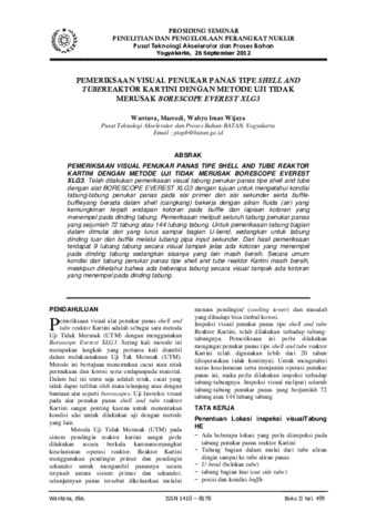 Wantana, Wantana and Marsudi, Marsudi and Iman Wijaya, Wahyu (2012) PEMERIKSAAN VISUAL PENUKAR PANAS TIPE SHELL AND TUBE REAKTOR KARTINI DENGAN METODE UJI TIDAK MERUSAK BORESCOPE EVEREST XLG3. PROSIDING SEMINAR PENELITIAN DAN PENGELOLAAN PERANGKAT NUKLIR Pusat Teknologi Akselerator dan Proses Bahan. pp. 495-499. ISSN 1410 – 8178