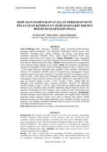 Mutu pelayanan kesehatan dapat memenuhi seluruh harapan pelanggan melalui peningkatan yang dilakukan berkelanjutan melalui proses yang dijalankan. Pelanggan yaitu, pasien, keluarga, dan lainnya yang datang untuk mendatkan pelayanan. Target Tingkat Kepuasan Pasien yang ditetapkan untuk tahun 2021 adalah 79%. Untuk mengetahui gambaran kepuasan pasien rawat jalan terhadap mutu pelayanan kesehatan di Rumah Sakit Khusus Bedah Banjarmasin Siaga. Desain penelitian ini menggunakan Cross Sectional dengan metode survey analitik. Dari penelitianinididapatkan sebanyak 50 responden (92,59%) pada uji reliability dengan p-value = 0,696 (p-value ≤ 0,05) artinya tidak ada hubungan yang signifikan antara reliability (kehandalan), sebanyak 48 responden (88,89%) pada uji responsiveness (ketanggapan) dengan kepuasan pasien rawat jalan, sebanyak 44 responden (81,48%) de dengan p-value = 0,004 (p-value ≤ 0,05) artinya ada hubungan yang signifikan antara responsiveness (ketanggapan) dengan kepuasan pasien rawat jalan, sebanyak 44 responden (81,48%) pada uji assurance dengan p-value = 0,521 (p-value ≤ 0,05) artinya tidak ada hubungan yang signifikan antara assurance (jaminan), sebanyak 48 responden (88,89%) dengan p-value = 0,300 (p-value ≤ 0,05) pada uji empathy artinya tidak ada hubungan yang signifikan antara empathy (perhatian) dengan kepuasan pasien, dan sebanyak 50 responden (92,59 %) dengan p-value = 0,002 (p-value ≤ 0,05) artinya ada hubungan yang signifikan antara tangible (bukti fisik/bukti langsung). Terdapat hubungan antara responsiveness (kehandalan) dan tangible (bukti fisik/bukti langsung) dengan kepuasan pasien rawat jalan di Rumah Sakit Khusus Bedah Banjarmasin Siaga dan tidak terdapat hubungan antara reliability (handal), Assurance (jaminan), dan Empathy (perhatian) terhadap kepuasan pasien rawat jalan di Rumah Sakit Khusus Bedah Banjarmasin Siaga.