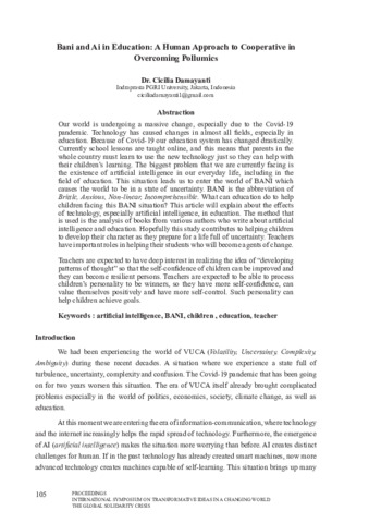Our world is undergoing a massive change, especially due to the Covid-19pandemic. Technology has caused changes in almost all ields, especially in education. Because of Covid-19 our education system has changed drastically.Currently school lessons are taught online, and this means that parents in the whole country must learn to use the new technology just so they can help with their children’s learning. The biggest problem that we are currently facing is the existence of artiicial intelligence in our everyday life, including in the ield of education. This situation leads us to enter the world of BANI which causes the world to be in a state of uncertainty. BANI is the abbreviation of Brittle, Anxious, Non-linear, Incomprehensible. What can education do to help children facing this BANI situation? This article will explain about the efects of technology, especially artiicial intelligence, in education. The method that is used is the analysis of books from various authors who write about artiicial intelligence and education. Hopefully this study contributes to helping children to develop their character as they prepare for a life full of uncertainty. Teachers have important roles in helping their students who will become agents of change.Teachers are expected to have deep interest in realizing the idea of “developing patterns of thought” so that the self-conidence of children can be improved and they can become resilient persons. Teachers are expected to be able to process children’s personality to be winners, so they have more self-conidence, can value themselves positively and have more self-control. Such personality can help children achieve goals.
