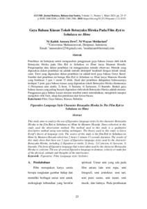 Penelitian ini bertujuan untuk menganalisis penggunaan gaya bahasa kiasan oleh tokoh Betsuyaku Hiroka pada film Ryū to Sobakasu no Hime karya Mamoru Hosoda. Pengumpulan data dalam penelitian ini menggunakan metode observasi. Metode yang digunakan dalam penelitian ini adalah metode deskriptif kualitatif dengan teknik simak catat. Teori yang digunakan dalam penelitian ini adalah teori gaya bahasa Gorys Keraf. Sumber dari penelitian ini berupa film Ryū to Sobakasu no Hime karya Mamoru Hosoda yang berdurasi 2 jam 1 menit 15 detik. Hasil dari penelitian didapatkan bahwasannya terdapat 5 jenis gaya bahasa kiasan yang digunakan tokoh Betsuyaku Hiroka diantaranya 1) Persamaan atau simile, 2) Ironi, 3) Sinisme, 4) Sarkasme, 5) Inuendo. Bentuk gaya bahasa kiasan yang paling banyak digunakan oleh tokoh Betsuyaku Hiroka adalah sinisme. Penggunaan gaya bahasa kiasan sinisme tersebut untuk merendahkan, mengkritik maupun mengolok-olok fisik, sikap dan pemikiran dari lawan bicara.