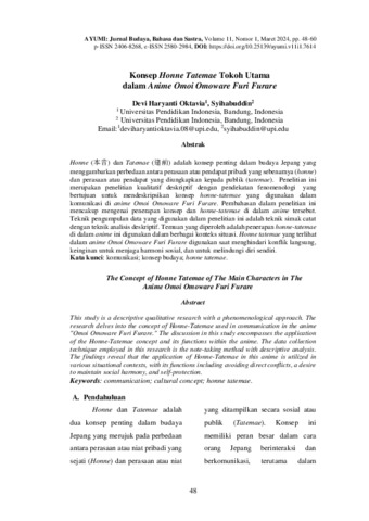 Devi, Haryanti Oktavia and Syihabuddin, Syihabuddin (2024) Konsep honne tatemae tokoh utama dalam anime Omoi Omoware Furi Furare. Jurnal Budaya, Bahasa, dan Sastra (AYUMI), 11 (1): 4. pp. 48-60. ISSN 2406-8268