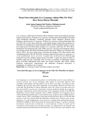 Anak, Agung Sagung Istri Pradnya Mahapurnayanti (2024) Pesan nonverbal pada love languages dalam film The Wind Rises karya Hayao Miyazaki. Jurnal Budaya, Bahasa, dan Sastra (AYUMI), 11 (1): 5. pp. 61-77. ISSN 2406-8268