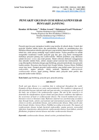 Hamdan, Ali Hartanto and Meilan, Arsanti and Muhammad, Syarif Wicaksono (2024) Penyakit gigi dan gusi sebagai penyebab penyakit jantung. Jurnal Teras Kesehatan, 7 (2): 2. pp. 11-18. ISSN 2622-2396