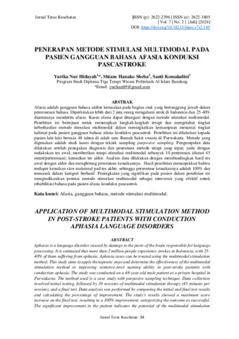 Yurika, Nur Hidayah and Shiane, Hanako Sheba and Santi, Komaladini (2024) Penerapan metode stimulasi multimodal pada pasien gangguan bahasa afasia konduksi pascastroke. Jurnal Teras Kesehatan, 7 (2): 5. pp. 34-44. ISSN 2622-2396