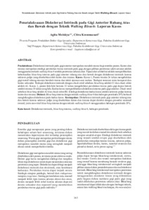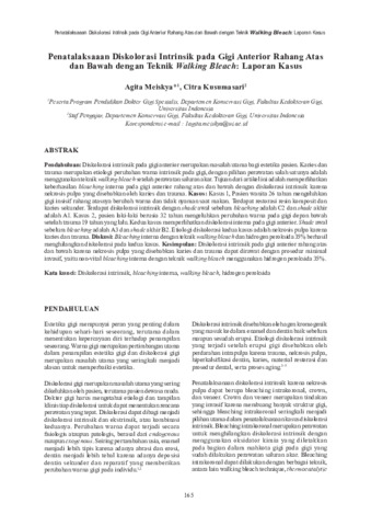 Agita, Meiskya and Citra, Kusumasari (2023) Penatalaksaaan diskolorasi intrinsik pada gigi anterior rahang atas dan bawah dengan teknik walking bleach: laporan kasus. In: Prosiding KPPIKG 2023: The 19th Scientific Meeting and Refresher Coursein Dentistry, Faculty of Dentistry, Universitas Indonesia, 2-4 Februari 2023, Jakarta Convention Center.