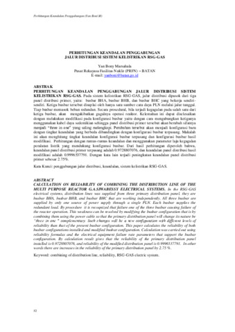PERHITUNGAN KEANDALAN PENGGABUNGAN JALUR DISTRIBUSI SISTEM KELISTRIKAN RSG-GAS. Pada sistem kelistrikan RSG-GAS, jalur distribusi dipasok dari tiga panel distribusi primer, yaitu: busbar BHA, busbar BHB, dan busbar BHC yang bekerja sendiri-sendiri. Ketiga busbar tersebut disuplai oleh hanya satu sumber catu daya PLN melalui jalur tunggal. Tiap busbar memasok beban redundan. Secara prosedural, bila terjadi kegagalan pada salah satu dari ketiga busbar, akan mengakibatkan gagalnya operasi reaktor. Kelemahan ini dapat diselesaikan dengan melakukan modifikasi pada konfigurasi busbar yaitu dengan cara mengabungkan ketiganya menggunakan kabel daya sedemikian sehingga panel distribusi primer tersebut akan berubah sifatnya menjadi “three in one” yang saling melengkapi. Perubahan tersebut akan menjadi konfigurasi baru dengan tingkat keandalan yang berbeda dibandingkan dengan konfigurasi busbar terpasang. Makalah ini akan menghitung tingkat keandalan konfigurasi busbar terpasang dan konfigurasi busbar hasil modifikasi. Perhitungan dengan rumus-rumus keandalan dan menggunakan parameter laju kegagalan peralatan listrik yang mendukung konfigurasi busbar. Dari hasil perhitungan diperoleh bahwa, keandalan panel distribusi primer terpasang adalah 0.9728807076, dan keandalan panel distribusi hasil modifikasi adalah 0.9996537791. Dengan kata lain terjadi peningkatan keandalan panel distribusi primer sebesar 2.75%.