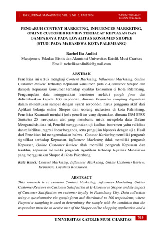 Rachel, Ika Andini (2024) Pengaruh content marketing, influencer marketing, online customer review terhadap kepuasan dan dampaknya pada loyalitas konsumen Shopee (Studi pada mahasiswa Kota Palembang). Konsumen & Konsumsi: Jurnal Manajemen, 3 (2): 5. pp. 705-724. ISSN 2808-4667