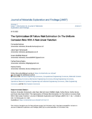 Fernanda, Hartoyo and Jaka, Fajar Fatriansyah and Imam, Abdillah Mas'ud and Farhan, Rama Digita and Hanna, Ovelia and Datu, Rizal Asral (2022) The optimization of failure risk estimation on the uniform corrosion rate with a non-linear function. Journal of Materials Exploration and Findings (JMEF), 1 (1): 1. pp. 1-9. ISSN 2963-251X