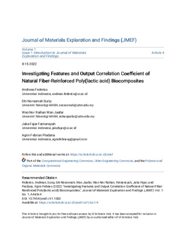 Andreas, Federico and Siti, Norasmah Surip and Wan, Nor Raihan Wan Jaafar and Jaka, Fajar Fatriansyah and Agrin, Febrian Pradana and Agrin, Febrian Pradana (2022) Investigating features and output correlation coefficient of natural fiber-reinforced poly(lactic acid) biocomposites. Journal of Materials Exploration and Findings (JMEF), 1 (1): 2. pp. 10-14. ISSN 2963-251X
