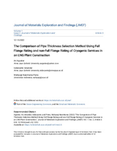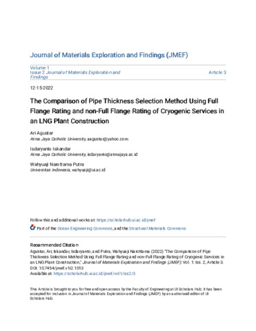 Ari, Agustar and Isdaryanto, Iskandar and Wahyuaji, Narottama Putra (2022) The comparison of pipe thickness selection method using full flange rating and non-full flange rating of cryogenic services in an LNG Plant Construction. Journal of Materials Exploration and Findings (JMEF), 1 (2): 3. pp. 57-68. ISSN 2963-251X