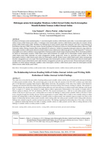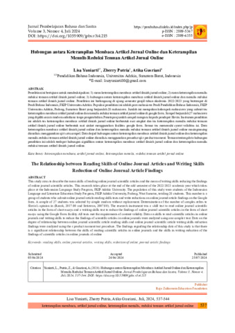 Penelitian ini bertujuan untuk mendeskripsikan: 1) mean keterampilan membaca artikel ilmiah jurnal online; 2) mean keterampilan menulis reduksi temuan artikel ilmiah jurnal online; 3) hubungan antara keterampilan membaca artikel ilmiah jurnal online dan menulis reduksi temuan artikel ilmiah jurnal online. Penelitian ini berlangsung di ujung semester ganjil tahun akademis 2022/2023 yang bertempat di Prodi Bahasa Indonesia, FKIP Universitas Adzkia. Populasi penelitian ini adalah para mahasiswa Prodi Pendidikan Bahasa Indonesia, FKIP Universitas Adzkia, Padang, Sumatera Barat yang berjumlah 28 mahasiswa. Jumlah ini merupakan kelompok mahasiswa yang submit tes keterampilan membaca artikel jurnal online dan menulis reduksi temuan artikel jurnal online di google form. Sampel berjumlah 27 mahasiswa yang dipilih secara random sederhana tanpa pengembalian. Penetapan jumlah sampel mengacu kepada pendapat Slavin. Instrumen penelitian ini adalah tes keterampilan membaca artikel ilmiah jurnal online berbentuk esai singkat dan tes keterampilan menulis reduksi temuan artikel ilmiah jurnal online berbentuk esai sinkat menggunakan fasilitas google form. Semua tes memenuhi syarat validitas isi. Data keterampilan membaca artikel ilmiah jurnal online dan keterampilan menulis reduksi temuan artikel ilmiah jurnal online masingmasing dianalisis menggunakan uji t satu sampel. Data derjad hubungan antara keterampilan membaca artikel ilmiah jurnal online dan keterampilan menulis reduksi temuan artikel ilmiah jurnal online dianalisis menggunakan prosedur uji r product moment. Temuan tentang data hubungan penelitian ini adalah terdapat hubungan signifikan antara keterampilan membaca artikel ilmiah jurnal online dan keterampilan menulis reduksi temuan artikel ilmiah jurnal online.