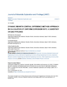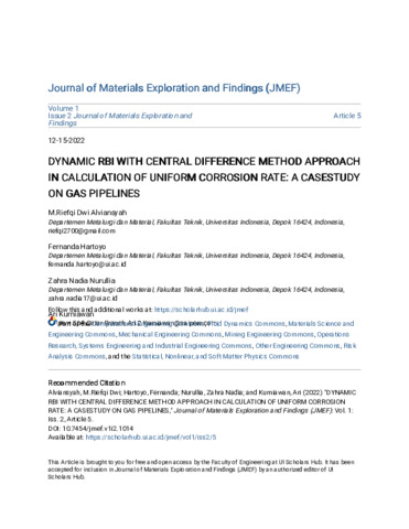 M.Riefqi, Dwi Alviansyah and Fernanda, Hartoyo and Zahra, Nadia Nurullia and Ari, Kurniawan (2022) Dynamic RBI with central difference method approach in calculation of uniform corrosion rate: A casestudy on gas pipelines. Journal of Materials Exploration and Findings (JMEF), 1 (2): 5. pp. 86-96. ISSN 2963-251X