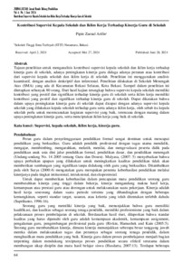 Tujuan penelitian untuk menganalisis kontribusi supervisi kepala sekolah dan iklim kerja terhadap kinerja guru di sekolah, adanya peningkatan kinerja guru diduga adanya peranan atau kontribusi dari supervisi kepala sekolah dan iklim kerja di sekolah. Penelitian ini menggunakan analisis kuantitatif, dengan analisis deskriptif dan inferensial. Penelitian dilakukan di Sekolah Menengah Atas (SMA) yang ada di Kecamatan Bekasi Selatan, Kota Bekasi. Sampel dalam penelitian ini ditetapkan sebanyak 80 orang. Dari hasil kajian terungkap bahwa supervisi kepala sekolah memiliki kontribusi yang positif dan signifikan terhadap kinerja guru di sekolah serta iklim kerja memiliki kontribusi yang positif dan signifikan terhadap kinerja guru di sekolah. Dapat dikatakan bahwa dalam upaya peningkatan kinerja guru di sekolah dapat dicapai dengan adanya supervisi kepala sekolah yang dilakukan kepala sekolah terhadap guru serta adanya iklim kerja, oleh sebab itu kepala sekolah perlu untuk merencanakan kegiatan supervisi yang baik, terencana dengan matang dalam upaya peningkatan kinerja guru, serta menciptakan iklim kerja yang baik di sekolah.