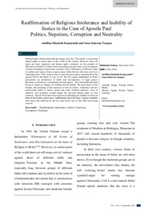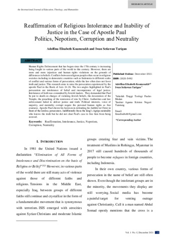 Adolfina, Elisabeth Koamesakh and Iwan, Setiawan Tarigan (2021) Reaffirmation of religious intolerance and inability of justice in the case of Apostle Paul politics, nepotism, corruption and neutrality. The International Journal of Education, Theology, and Humanities, 1 (1): 3. pp. 21-34. ISSN 3031-5077