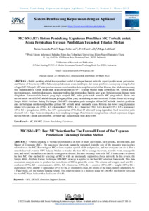 Raissa, Amanda Putri and Bagus Setiawan, Setiawan and Dwi Yanti Laily, Yanti Laily and Mega, Andriani (2022) MC-SMART: Sistem pendukung keputusan pemilihan MC terbaik untuk acara perpisahan Yayasan Pendidikan Teknologi Teladan Medan. Sistem Pendukung Keputusan dengan Aplikasi, 1 (1): 2. pp. 12-23. ISSN 2829-2820