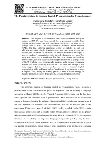 Wahyu, Satya Gumelar and Tyara, Sucia Lestari (2024) The Phonics Method to increase English pronounciation for young learners. Jurnal Simki Pedagogia, 7 (2): 2. pp. 350-362. ISSN 2807-2790