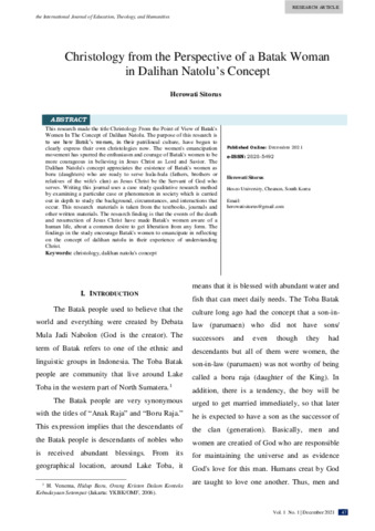Herowati, Sitorus (2021) Christology from the perspective of a Batak woman in Dalihan Natolu’s concept. The International Journal of Education, Theology, and Humanities, 1 (1): 5. pp. 47-59. ISSN 3031-5077