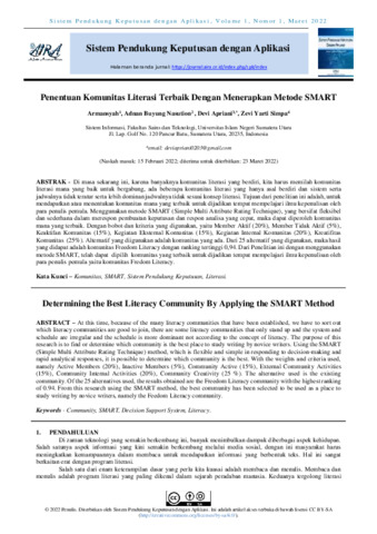 Armansyah, Armansyah and Adnan, Buyung Nasution and Devi, Apriani and Zevi, Yarti Simpa (2022) Penentuan komunitas literasi terbaik dengan menerapkan metode SMART. Sistem Pendukung Keputusan dengan Aplikasi, 1 (1): 4. pp. 35-45. ISSN 2829-2820