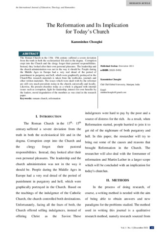 Herowati, Sitorus (2021) The reformation and its implication for today’s church. The International Journal of Education, Theology, and Humanities, 1 (1): 6. pp. 60-73. ISSN 3031-5077