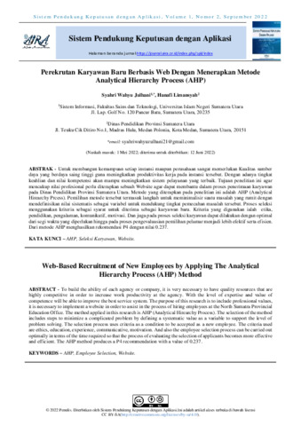 Syahri, Wahyu Julhani and Hanafi, Limansyah (2022) Perekrutan karyawan baru berbasis web dengan menerapkan metode Analytical Hierarchy Process (AHP). Sistem Pendukung Keputusan dengan Aplikasi, 1 (2): 4. pp. 89-99. ISSN 2829-2820