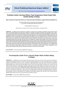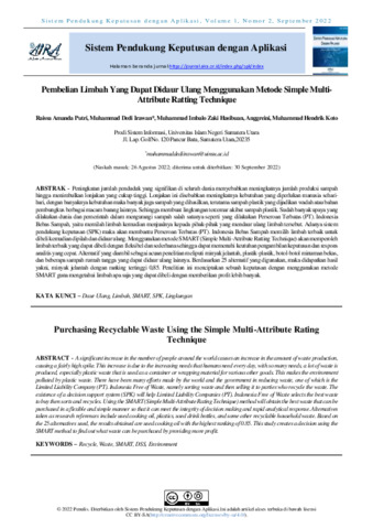Raissa, Amanda Putri and Muhammad, Dedi Irawan and Muhammad, Imbalo Zaki Hasibuan and Anggraeni, Anggraeni and Muhammad, Hendrik Koto (2022) Pembelian limbah yang dapat didaur ulang menggunakan metode Simple Multi-Attribute Ratting Technique. Sistem Pendukung Keputusan dengan Aplikasi, 1 (2): 5. pp. 100-109. ISSN 2829-2820