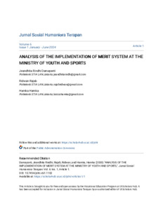 Jeandhita, Rindhi Damayanti and Ridwan, Rajab and Hamka, Hamka (2024) Analysis of the implementation of merit system at the Ministry of Youth and Sports. Jurnal Sosial Humaniora Terapan, 6 (1): 1. pp. 1-10. ISSN 2622-1764