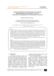 Penelitian berupa studi kasus pada salah satu pegadaian syariah di kabupaten Aceh Jaya. Berupa penelitian survey, jenis penelitian descriptive dan verificative. Ditemukan bahwa: (1) faktor human capital berdasarkan individual capability ketercapaiannya sebesar 78,3%. Individual motivation dengan tingkat pencapaiannya 82%. Aspek leadership, masih rendah sebesar 74%. Aspek the organizational climate, cukup baik 82,3%, dan aspek workgroup effectiveness mencapai tingkat 80,5%. Tingkat produktivitas kerja pegadaian syariah di Aceh Jaya sebesar 80,67 %. (2) Secara simultans hubungan human capital terhadap produktivitas kerja sebesar 0,898 dengan besar kontribusi human capitaldari unsur individual capability, individual motivation, leadership, the organizational climate, dan work group effectiveness terhadap produktivitas kerja, sebesar 80,7%