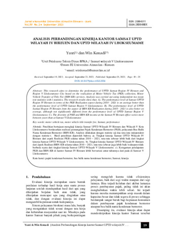 Yusri, Yusri and Win, Konadi (2023) Analisis perbandingan kinerja kantor Samsat UPTD Wilayah IV Bireuen dan UPTD Wilayah IV Lhokseumawe. Jurnal Ekonomi dan Pembangunan (Ekonomika), 15 (2): 3. pp. 19-25. ISSN 2086-6011