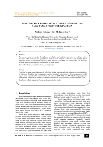 Nafaza, Rahma and M., Rasyidin (2023) Pertumbuhan kredit akibat tingkat inflasi dan suku bunga kredit di Indonesia. Jurnal Ekonomi dan Pembangunan (Ekonomika), 15 (2): 4. pp. 26-32. ISSN 2086-6011
