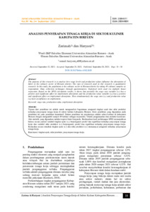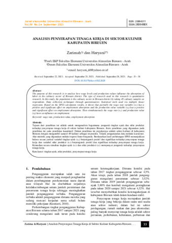Zarimah, Zarimah and Haryani, Haryani (2023) Analisis penyerapan tenaga kerja di sektor kuliner Kabupaten Bireuen. Jurnal Ekonomi dan Pembangunan (Ekonomika), 15 (2): 5. pp. 33-38. ISSN 2086-6011