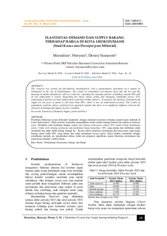 Marzalina, Marzalina and Haryani, Haryani and Denny, Sumantri (2024) Elastisitas demand dan supply barang terhadap harga di Kota Lhokseumawe (Studi kasus atas persepsi para milenial). Jurnal Ekonomi dan Pembangunan (Ekonomika), 16 (1): 3. pp. 14-18. ISSN 2086-6011