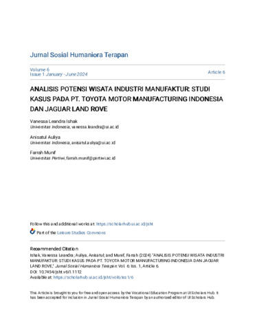 Vanessa, Leandra Ishak and Anisatul, Auliya and Farrah, Munif (2024) Analisis potensi wisata industri manufaktur: Studi kasus pada PT. Toyota Motor Manufacturing Indonesia dan Jaguar Land Rover. Jurnal Sosial Humaniora Terapan, 6 (1): 6. pp. 55-67. ISSN 2622-1764