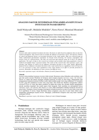 Andi, Wahyudi and Mukhlis, Mukhlis and Nova, Nova and Musrizal, Musrizal (2024) Analisis faktor determinan pengambilan keputusan investasi di pasar kripto. Jurnal Ekonomi dan Pembangunan (Ekonomika), 16 (1): 5. pp. 26-31. ISSN 2086-6011