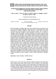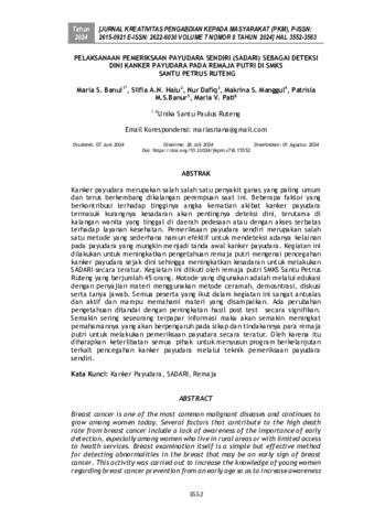Maria, S. Banul and Silfia, A.N. Halu and Nur, Dafiq and Makrina, S. Manggul and Patrisia, M.S.Banur and Maria, V. Pati (2024) Pelaksanaan Pemeriksaan Payudara Sendiri (SADARI) sebagai deteksi dini kanker payudara pada remaja putri di SMKS Santu Petrus Ruteng. Jurnal Kreativitas Pengabdian kepada Masyarakat, 7 (8): 25. pp. 3552-3563. ISSN 2615-0921