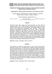 Prevalensi anemia pada remaja putri pada kelompok usia 15-24 tahun di Indonesia berkisar 27,2%. Pondok pesantren Sabilul Ulum Al-Hidayah memiliki banyak santriwati pada usia remaja yang juga membutuhkan asupan gizi salah satunya untuk pembentukan hemoglobin agar tercukupi. Tujuan untuk melakukan pemeriksaan hemoglobin untuk skrining anemia. Pengabdian Masyarakat dilakukan dengan observasi langsung melalui wawancara dan pemeriksaan hemoglobin menggunakan POCT. Data disajikan dalam bentuk frekuensi. Jumlah santriwati yang mengikuti kegiatan pengabdian Masyarakat yaitu 32 orang dengan rentang umur 13 – 17 tahun. Sebagian besar santriwati tidak sedang diet atau melakukan puasa secara rutin (22 orang) dan sebagian besar tidak sedang menstruasi (24 orang). Santriwati yang mengalami anemia yaitu sebanyak 10 orang. Telah terjaring sebanyak 10 santriwati yang mengalami anemia, dan 5 diantaranya sedang mengalami menstruasi.