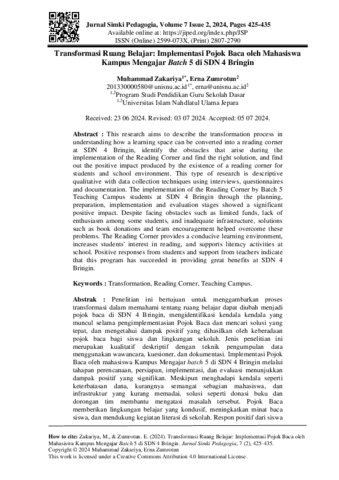 Penelitian ini bertujuan untuk menggambarkan proses transformasi dalam memahami tentang ruang belajar dapat diubah menjadi pojok baca di SDN 4 Bringin, mengidentifikasi kendala kendala yang muncul selama pengimplementasian Pojok Baca dan mencari solusi yang tepat, dan mengetahui dampak positif yang dihasilkan oleh keberadaan pojok baca bagi siswa dan lingkungan sekolah.Jenis penelitian ini merupakan kualitatif deskriptif dengan teknik pengumpulan data menggunakan wawancara, kuesioner, dan dokumentasi.Implementasi Pojok Baca oleh mahasiswa Kampus Mengajar batch5 di SDN 4 Bringin melalui tahapan perencanaan, persiapan, implementasi, dan evaluasi menunjukkan dampak positif yang signifikan. Meskipun menghadapi kendala seperti keterbatasan dana, kurangnya semangat sebagian mahasiswa, dan infrastruktur yang kurang memadai, solusi seperti donasi buku dan dorongan tim membantu mengatasi masalah tersebut. Pojok Baca memberikan lingkungan belajar yang kondusif, meningkatkan minat baca siswa, dan mendukung kegiatan literasi di sekolah. Respon positif dari siswa dan dukungan dari guru mengindikasikan bahwa program ini berhasil memberikan manfaat yang besar di SDN 4 Bringin.