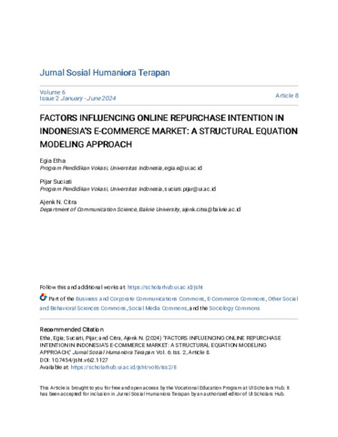 Egia, Etha and Pijar, Suciati and Ajenk, N. Citra (2024) Factors influencing online repurchase intention in Indonesia’s e-commerce market: A structural equation modeling approach. Jurnal Sosial Humaniora Terapan, 6 (2): 7. pp. 68-78. ISSN 2622-1764