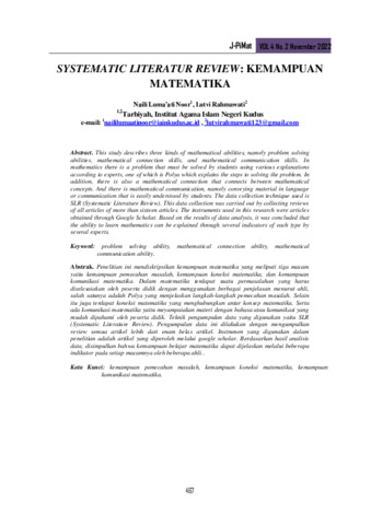 | Uncontrolled Keywords: | Kemampuan pemecahan masalah, Kemampuan koneksi matematika, Kemampuan komunikasi matematika, Mathematics education, Cognitive skills, Systematic literature review |