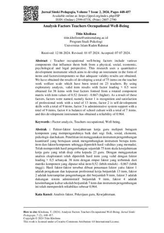 Titin, Kholisna (2024) Analysis factors teachers occupational well-being. Jurnal Simki Pedagogia, 7 (2): 11. pp. 448-457. ISSN 2807-2790