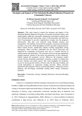 R. Histato, Dayanto Kobasah and Sri, Nurhayati (2024) Strategies and impacts of The Sukabumi Reading Enthusiast Program on Community Literacy. Jurnal Simki Pedagogia, 7 (2): 12. pp. 458-469. ISSN 2807-2790