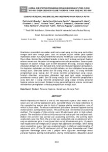 Patrisia, M.S Bandur and Maria, Conchita Leyla Centis and Geusepina, D. Mami and Elisabeth, J. Serni 4 and Yuliana, Talun and Maria, S. Delasetia and Oktaviani, Letra and Tekla, Hartiarni and Oktaviani, Yudit and Astriana, Pagung and Apolonia, Anut (2024) Edukasi personal hygiene selama mestruasi pada remaja putri. Jurnal Kreativitas Pengabdian kepada Masyarakat, 7 (8): 34. pp. 3653-3660. ISSN 2615-0921