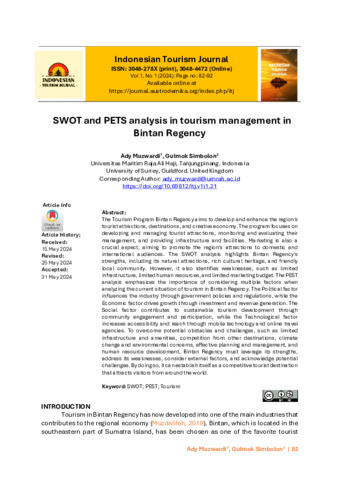Aldy, Muzwardi and Gulmok, Simbolon (2024) SWOT and PEST analysis in tourism management in Bintan Regency. Indonesian Tourism Journal, 1 (1): 7. pp. 82-92. ISSN 3048-278X