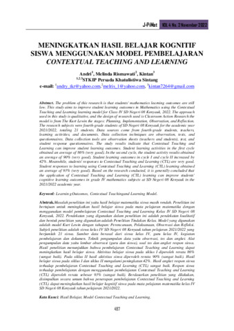 Andri, Andri and Melinda, Rismawati and Kintan, Kintan (2022) Meningkatkan hasil belajar kognitif siswa kelas iv pada mata pelajaran matematika dengan menggunakan model pembelajaran Contextual Teaching and Learning (CTL). Jurnal Pendidikan Matematika (J-PiMat), 4 (2): 4. pp. 487-496. ISSN 2684-7981