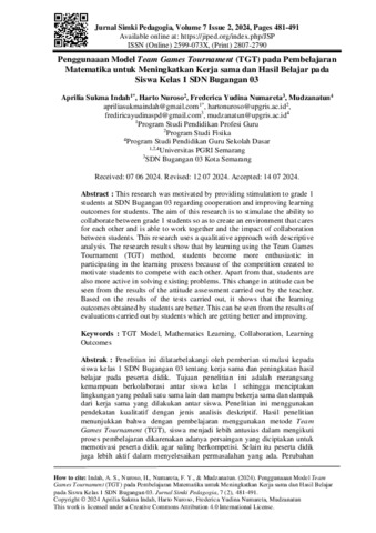 Aprilia, Sukma Indah and Harto, Nuroso and Frederica, Yudina Numareta and Mudzanatun, Mudzanatun (2024) Penggunaaan Model Team Games Tournament (TGT) pada pembelajaran Matematika untuk meningkatkan kerja sama dan hasil belajar pada siswa Kelas 1 SDN Bugangan 03. Jurnal Simki Pedagogia, 7 (2): 14. pp. 481-491. ISSN 2807-2790
