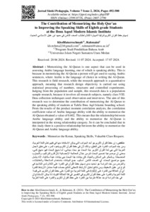 والغرض من هذه الدراسة هو تحديد مدى إسهام حفظ القرآن في القدرة على الكالم لدى التالميذ في كوخ ابن عقيل التحفيظ، ومن نتائج تحليل االرتباط اللحظي الناتج حصلت قيمة معامل االرتباط للقدرة أي أن العالقة بين القدرة على 0.602على اللغة العربية مع القدرة على حفظ القرآن الكريم على قيمة اللغة العربية والقدرة على حفظ القرآن الكريم في التفسير في فئة العالقة القوية، لذا يمكن االستنتاج أن في هذه الدراسة توجد عالقة طردية بين القدرة على حفظ القرآن الكريم والقدرة على اللغة العربية