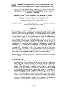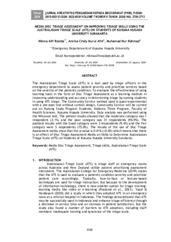 Nikma, Alfi Rosida and Annisa, Cindy Nurul Afni and Muhamad, Nur Rahmad (2024) Media disc triage assessment on improving triage skills using the Australasian Triage Scale (ATS) Kusuma Husada University Surakarta. Jurnal Kreativitas Pengabdian kepada Masyarakat, 7 (8): 38. pp. 3700-3713. ISSN 2615-0921