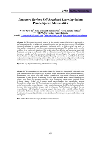 Vorry, Navyola and Pinta, Deniyanti Sampoerno and Flavia, Aurelia Hidajat (2022) Literature review: Self regulated learning dalam pembelajaran matematika. Jurnal Pendidikan Matematika (J-PiMat), 4 (2): 5. pp. 497-506. ISSN 2684-7981
