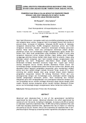 Siti, Rusyanti and Omo, Sutomo (2024) Pemberdayaan remaja dalam mengatasi dismenore primer dengan cara non farmakologi di SMPN 2 Sajira Kabupaten Lebak Provinsi Banten. Jurnal Kreativitas Pengabdian kepada Masyarakat, 7 (8): 42. pp. 3748-3762. ISSN 2615-0921